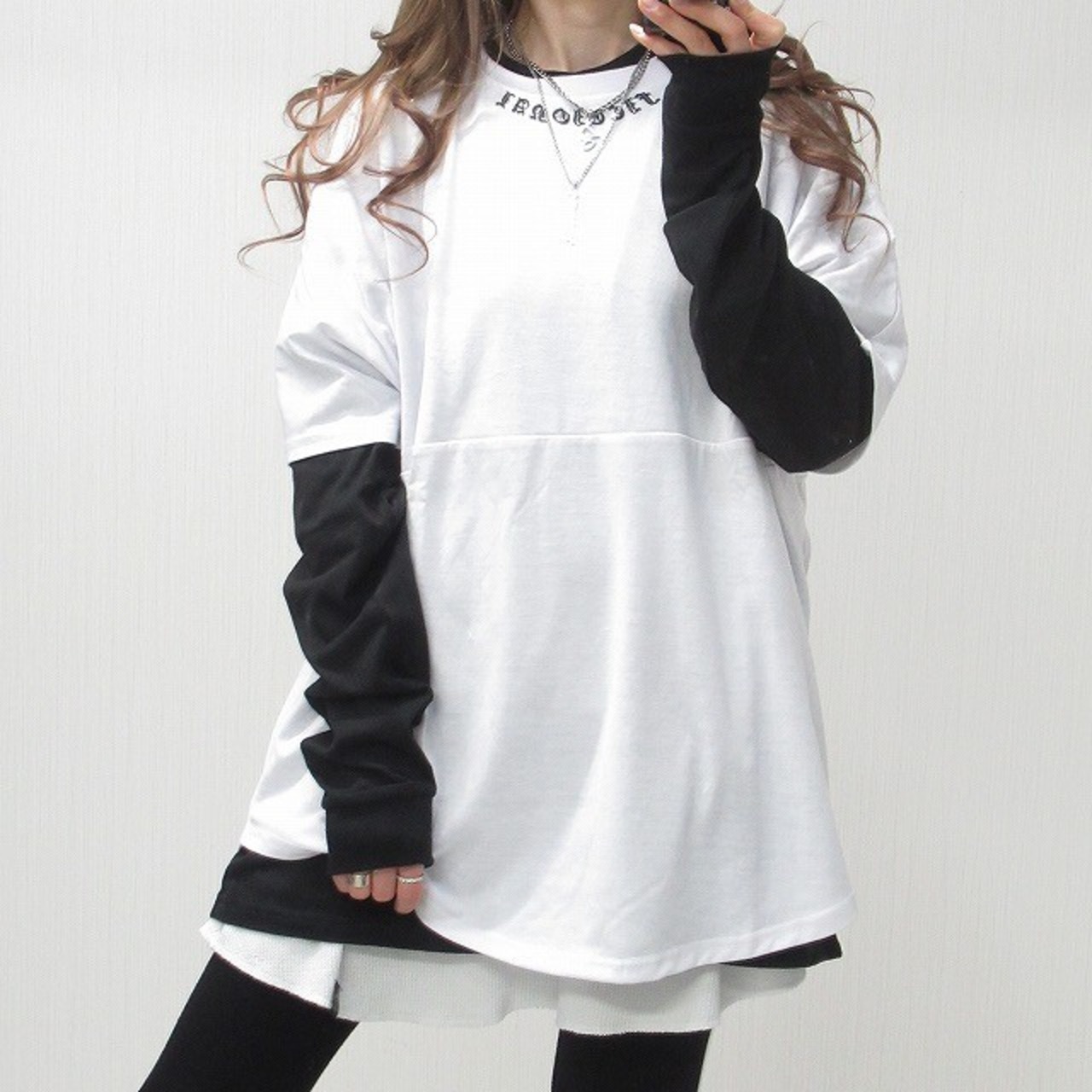 【2枚組】首元ロゴ バックロゴ 発泡プリント 重ね着レイヤード ロンT&Tシャツ set ホワイト