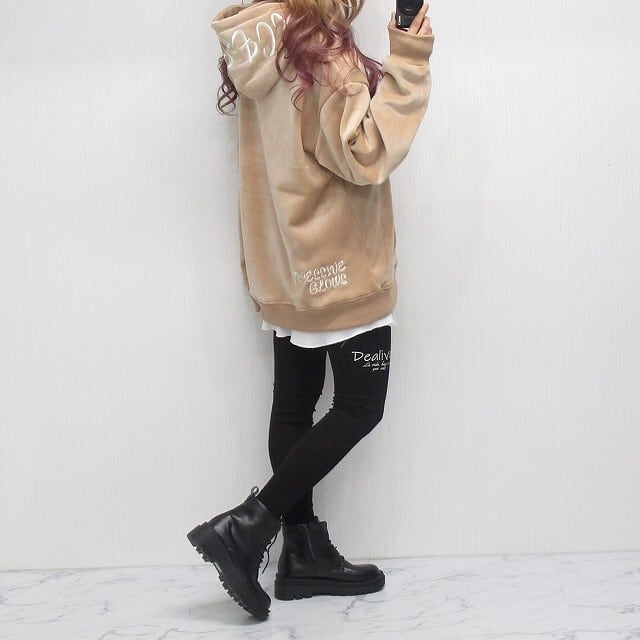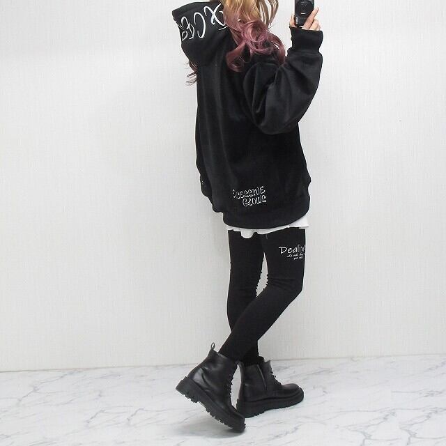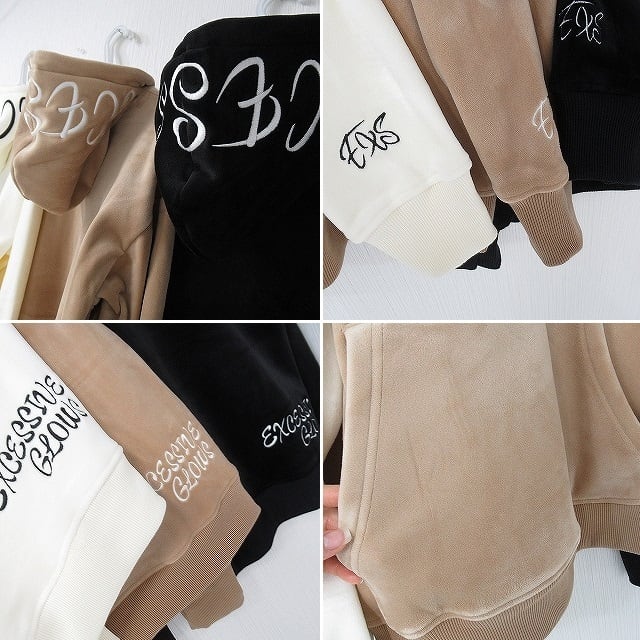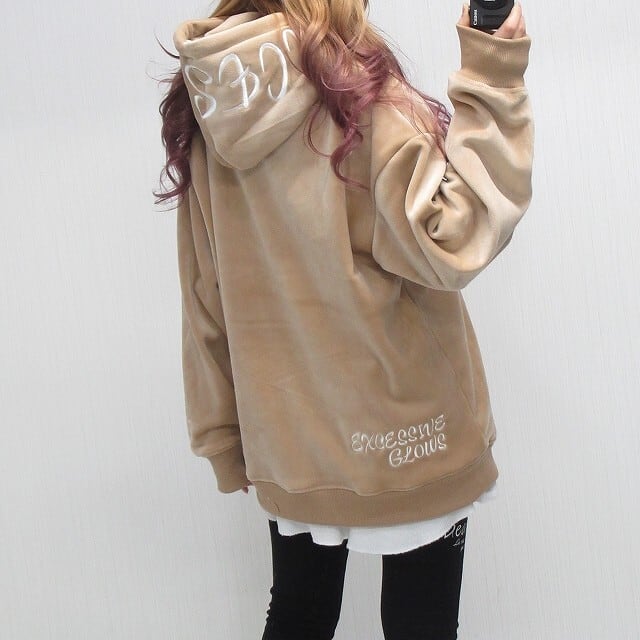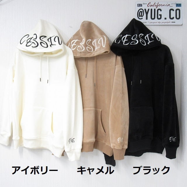 フードロゴ ALL刺繍 ベロア調 上質 厚手 パーカー オーバーシルエット