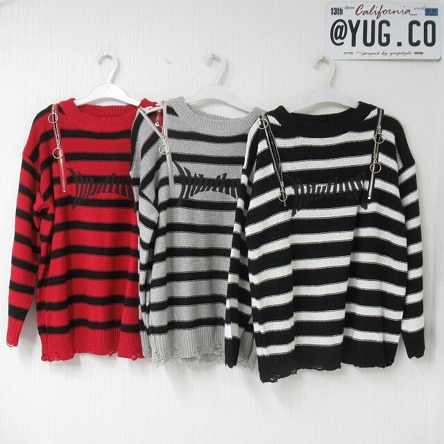 肩あき Zip開閉OK オフショル ボーダー ダメージ ニット レッド インポート