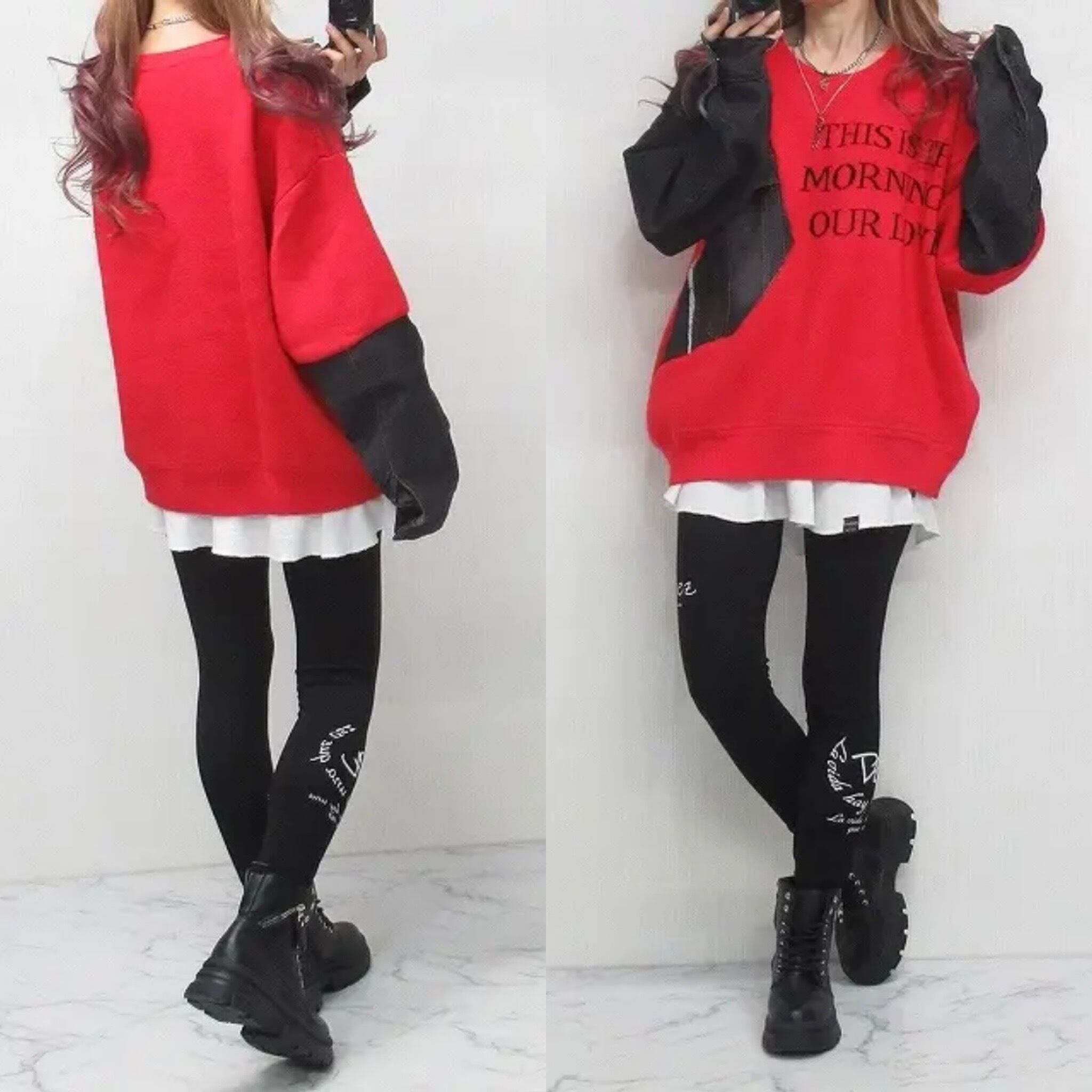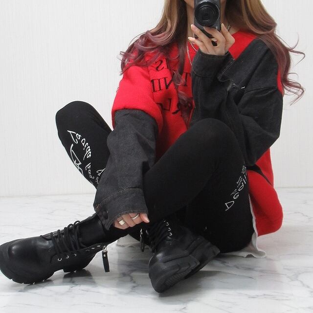 デニム切替ニット Frontロゴ 重ね着 一体型 レイヤード もっちり ニット レッド