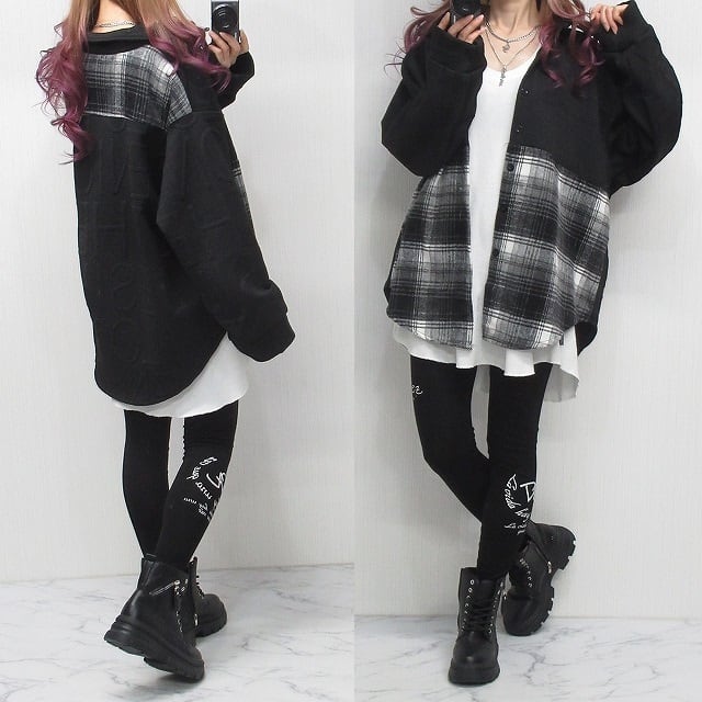チェック柄 英字ロゴ エンボス 異素材MIX BIGシルエット オーバーシャツ