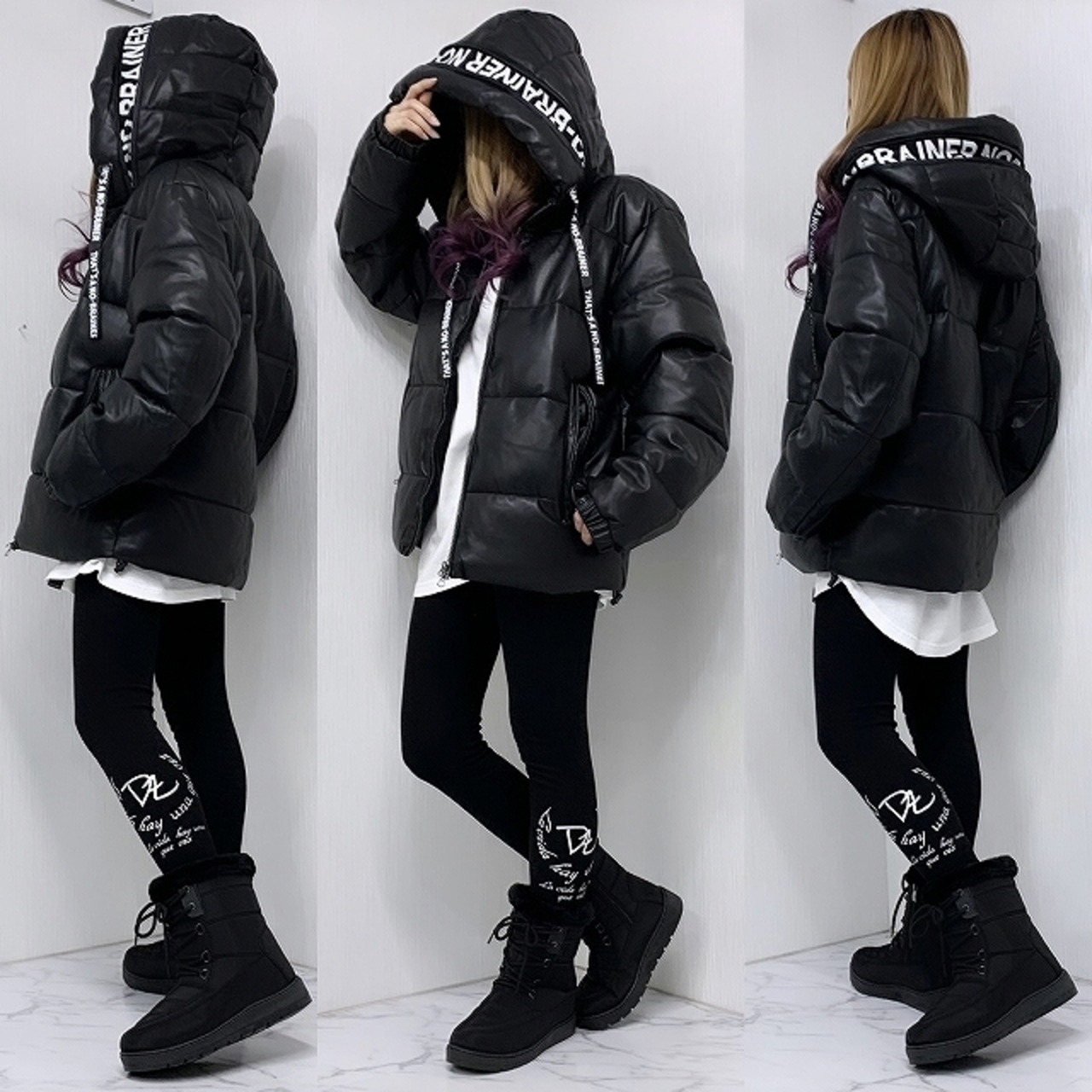 フェイクレザー フードZIP開閉ロゴ 2WAY 紐ロゴ 撥水・防風 中綿 ダウンジャケット 真冬OK ユニセックス