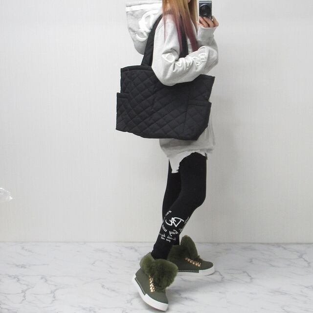 キルティング 中綿 トートバッグ 大きめ収納抜群!外ポケ付き ZIP開閉 Bag