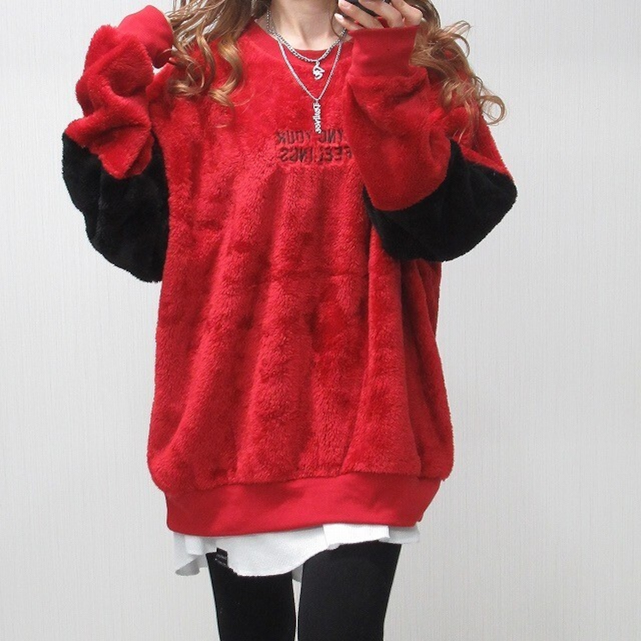 バックロゴ ワッペン刺繍 袖配色切替 ファーボア 肉厚 プルオーバー トレーナー レッド