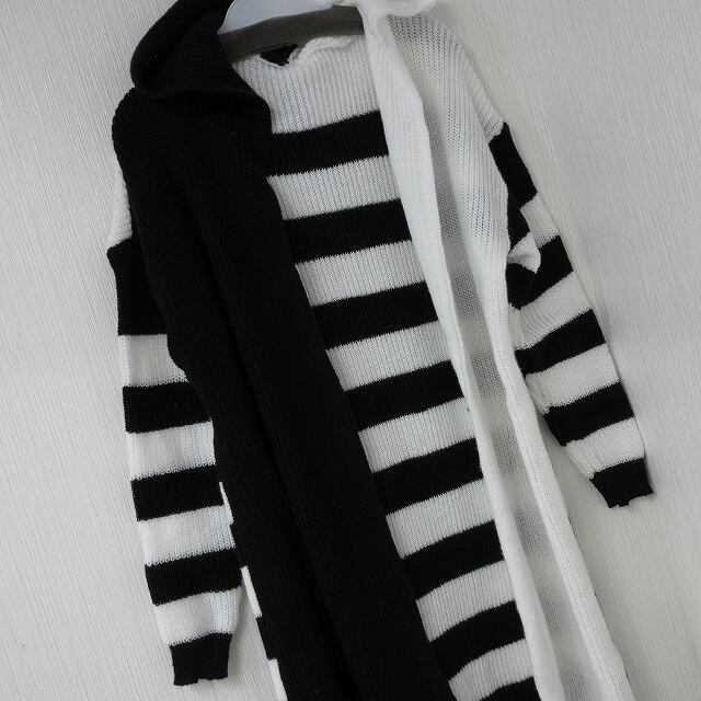 バイカラー ボーダー配色 フード付 ロングカーディガン